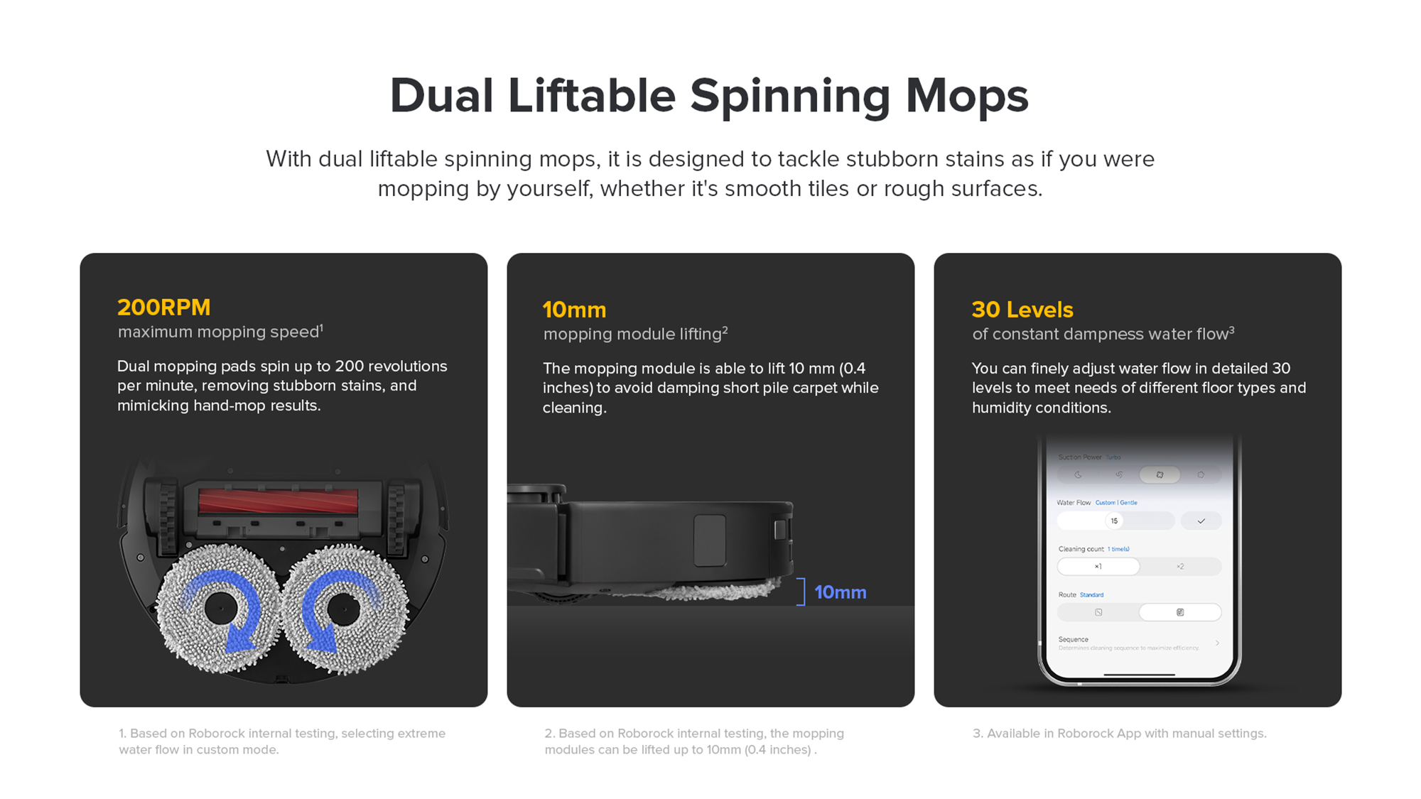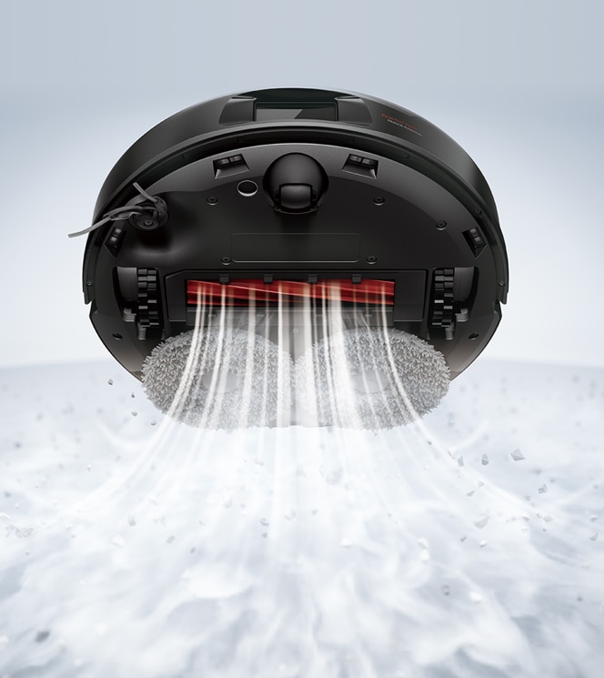 Auto-spalare pentru mop Dock-ul multifunctional emuleaza procesul de curatare al unei masini de spalat pentru mopuri, disponand de o pre-spalare lenta, o clatire medie si o uscare prin centrifugare la viteza mare. Acesta ajusteaza dinamic viteza si debitul de apa pentru o eficienta ridicata si confort. Proces de curatare dinamic in 3 etape |