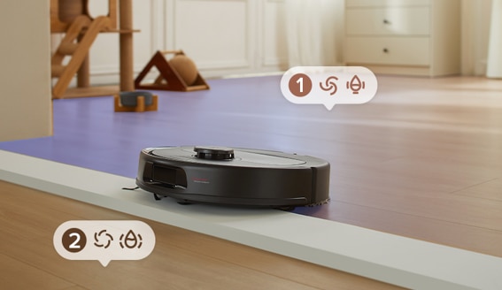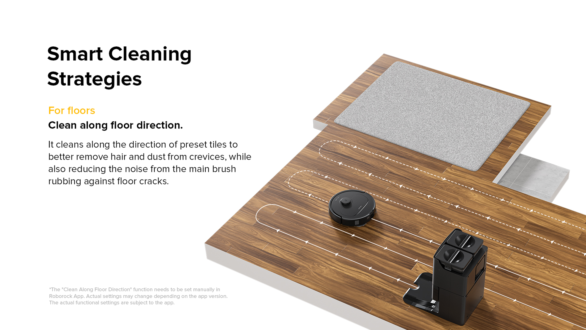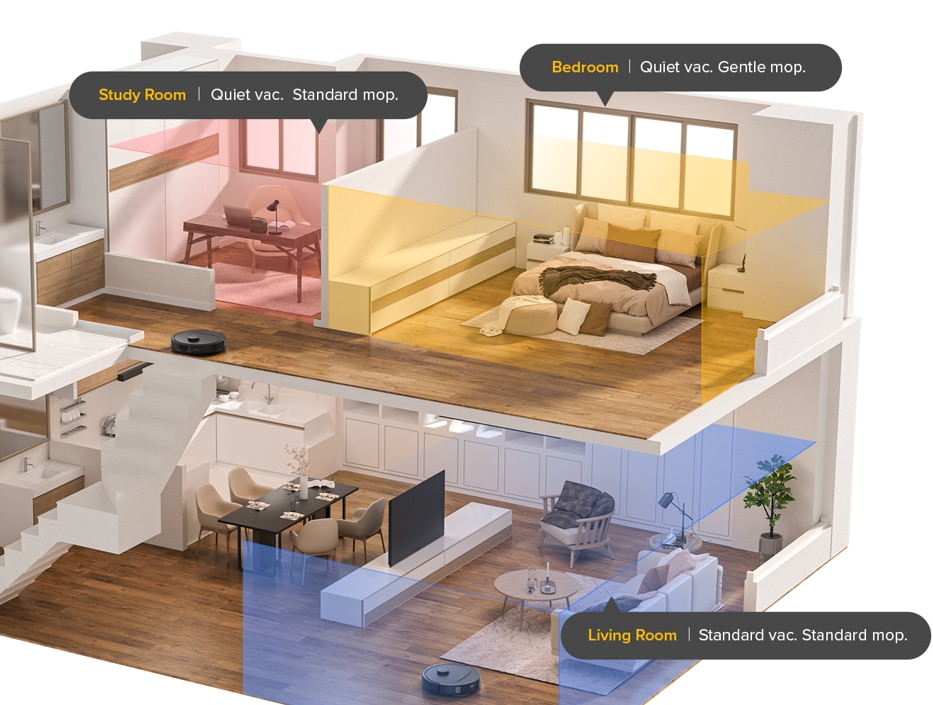 Roborock SmartPlan Roborock SmartPlan adapteaza programul optim de curatare in functie de tipul camerei*. Daca ati setat diferite tipuri de podea, va adapta strategiile de curatare in consecinta. |