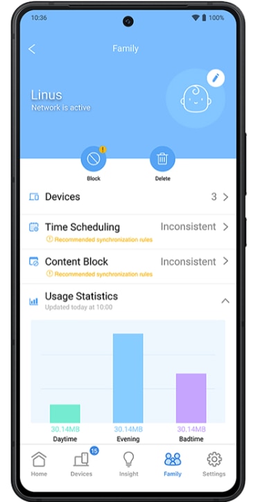 Protectie familiala mai sigura si mai inteligenta Protectia familiala avansata si controlul parental va permit sa cultivati o viata digitala echilibrata pentru dumneavoastra si copiii dumneavoastra, totul fara abonamente. Tablou de bord pentru activitatea pe internet Monitorizati utilizarea internetului de catre copiii dvs. prin intermediul unui tablou de bord grafic cuprinzator. Vedeti dintr-o privire timpul petrecut online, consumul de date si activitatea lor specifica dispozitivelor. Profiluri prestabilite pe niveluri de varsta Profilurile prestabilite filtreaza automat continutul nepotrivit si stabilesc programe de petrecere a timpului pe ecran, facilitand aplicarea setarilor in functie de varsta copiilor dvs. Programare flexibila a timpului Definiti orele online si offline pentru fiecare copil, asigurand un timp de vizionare echilibrat si promovand obiceiuri digitale sanatoase. Rasplatiti comportamentul bun cu timp online suplimentar, ca o intarire pozitiva. Navigare sigura Personalizati protectia pentru utilizatori individuali sau pentru un grup de dispozitive cu filtre de siguranta pentru securizarea activitatilor online. |